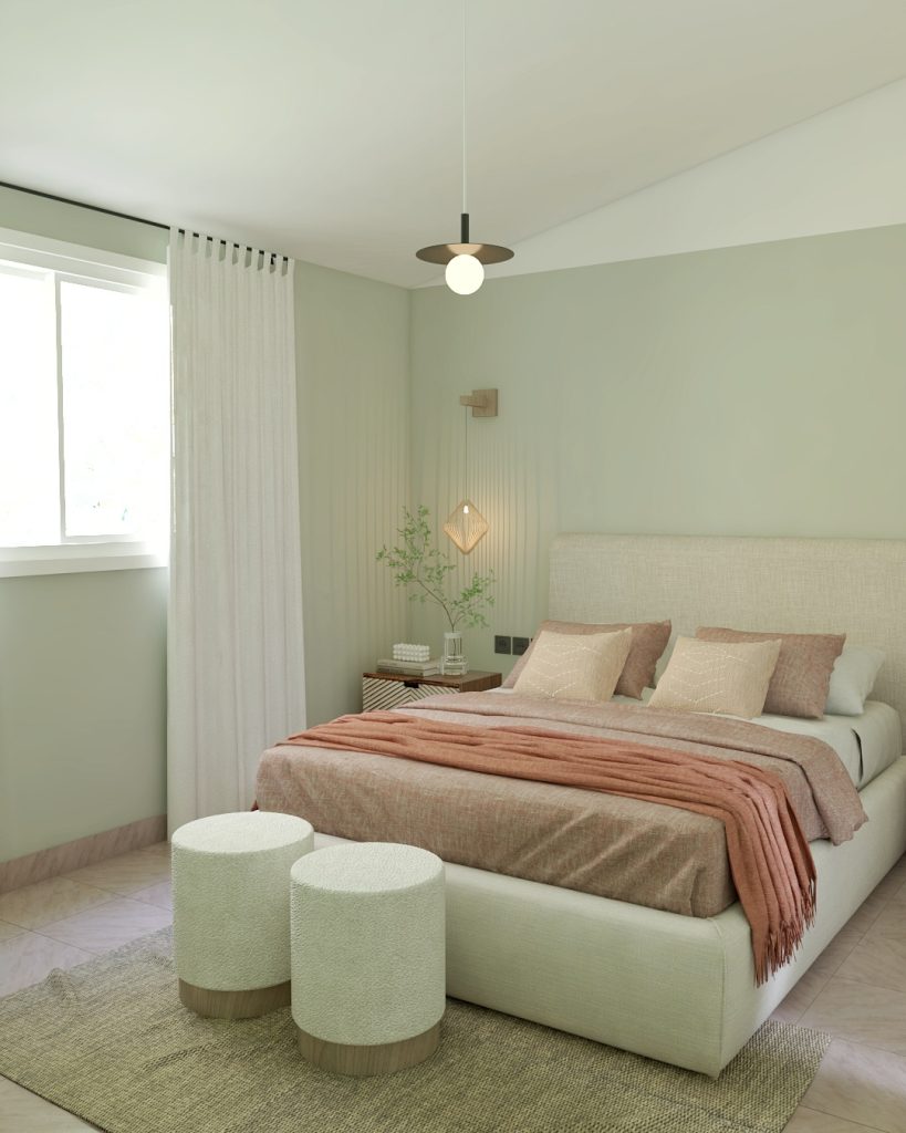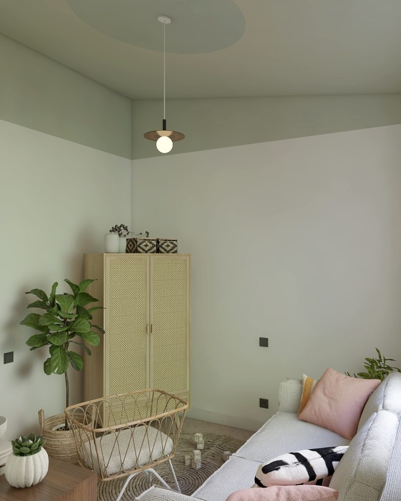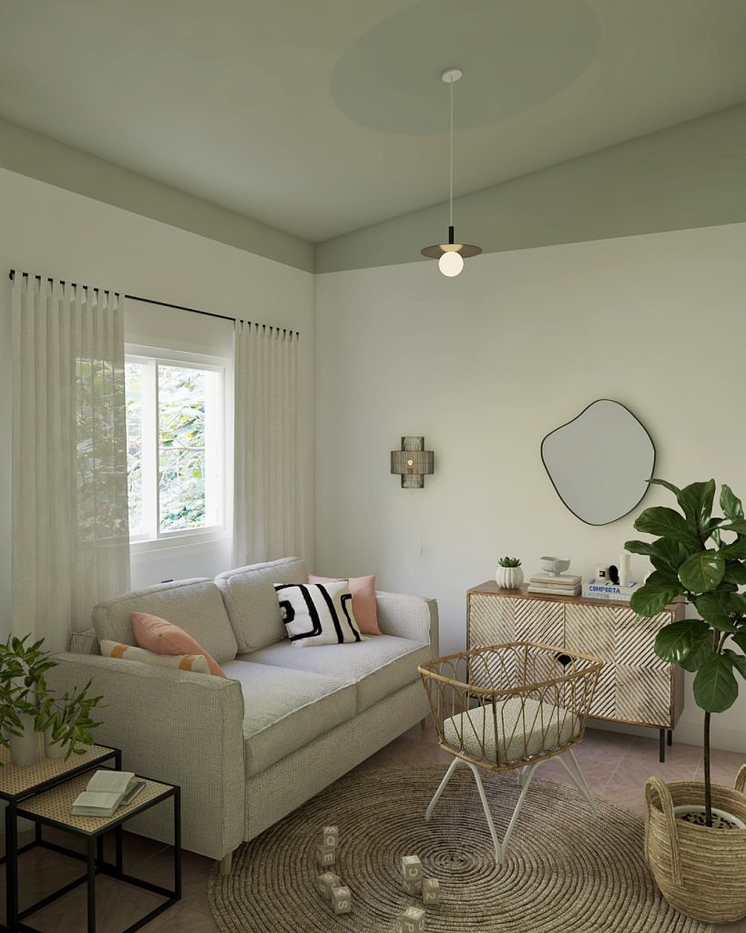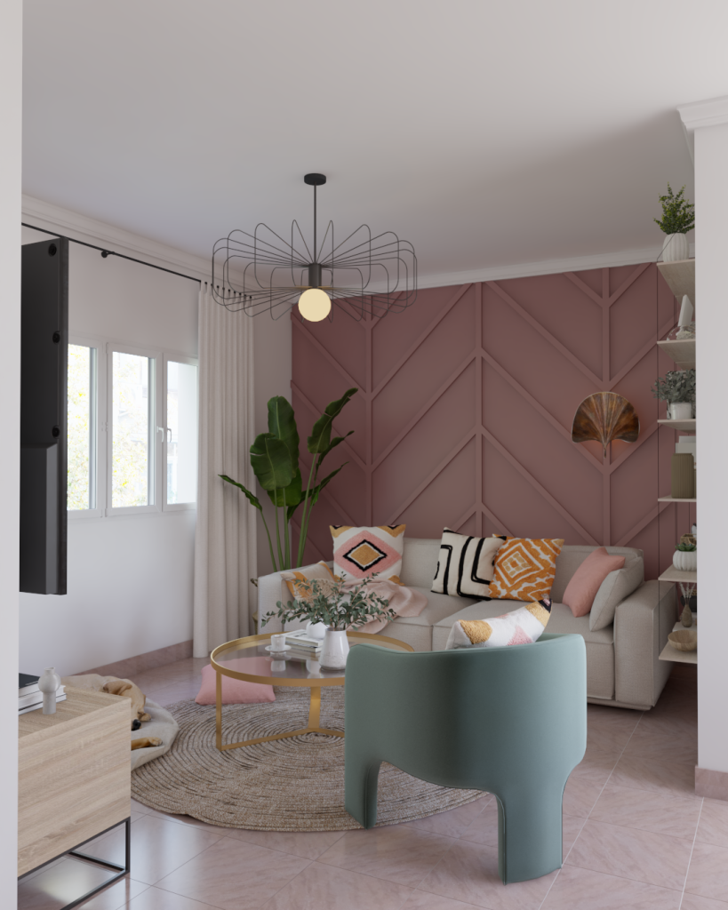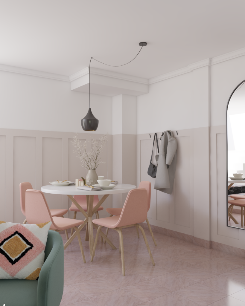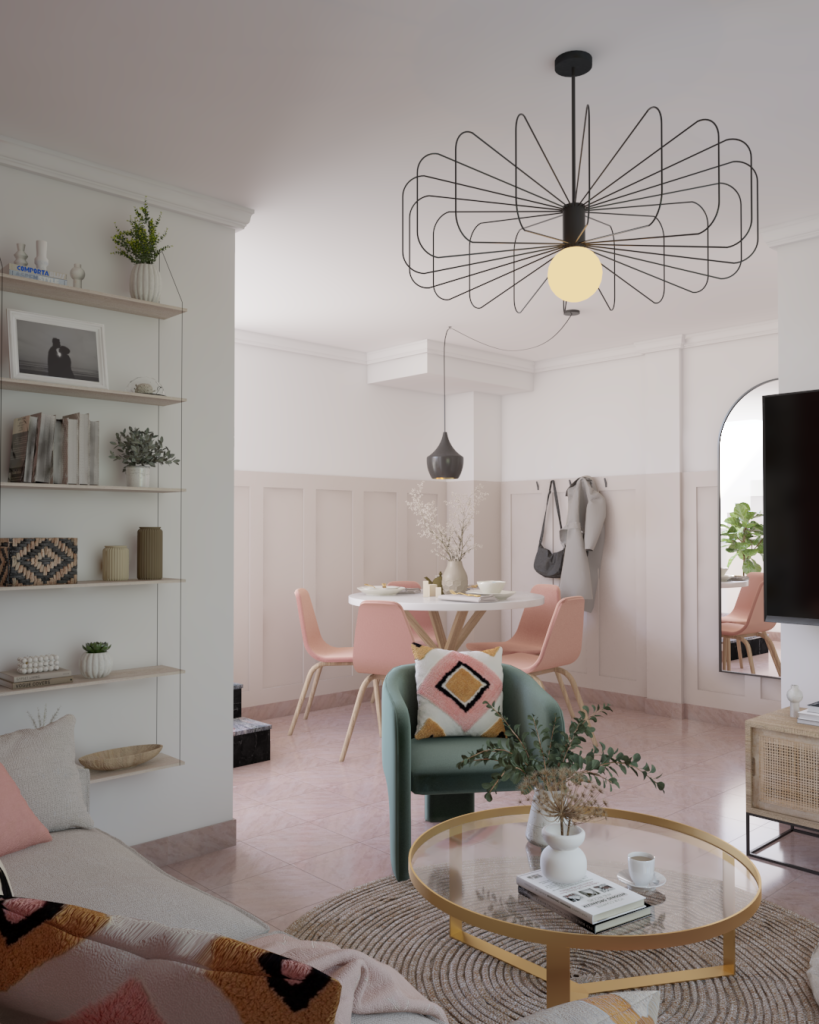 En este proyecto de asesoramiento decorativo hemos transformado por completo un salón comedor sin realizar ningún tipo de reforma. Únicamente a través de la decoración, mediante una correcta elección de mobiliario, iluminación y elementos decorativos. La pared de acento en malva suave, los elementos en ratán, el friso en color avellana y la combinación de elementos metálicos en negro y dorado le dan un toque de estilo a esta preciosa vivienda.